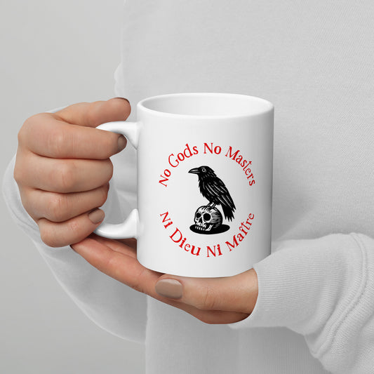 "No Gods No Masters / Ni Dieu Ni Maître" Raven Skull White Glossy Mug