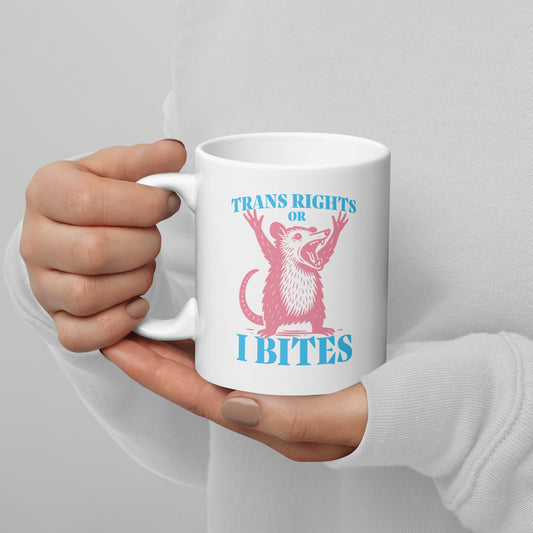 "Trans Rights Or I Bites" Trans Pride Opossum Graphic White Glossy Mug