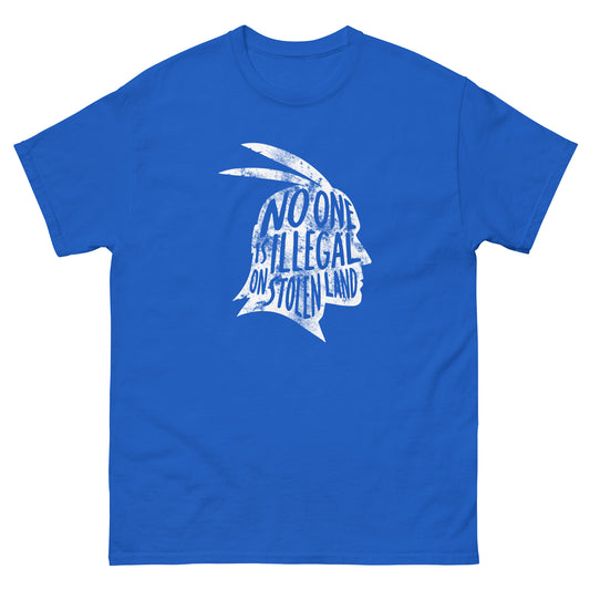 Person wearing the cream “No One Is Illegal on Stolen Land” tee layered under a brown plaid shirt, styled for a casual activist look.
